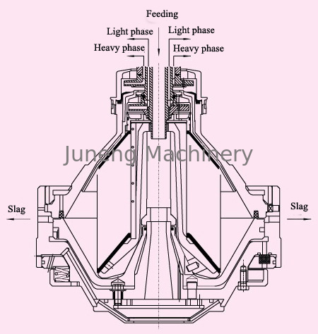 Les matériaux non filtrés (liquide mélangé) sont transmis aux pièces de coeur de cette machine (l'intérieur du tambour). Sous les actions de la force centrifuge forte, les matériaux passeront cependant les intervalles d'un groupe de paquets de morceau de disque. Et puis, le trou neutre du morceau de disque étant l'interface, le liquide avec plus à haute densité (phase lourde) montera le trou neutre le long du morceau de disque, coulant dans la grande pompe centripète. Les résidus lourds seront accumulés dans le secteur de sédiment, attendant la décharge hors de la machine. Le liquide avec un plus faible densité (phase légère) se déplacera vers l'intérieur et vers le haut le long du mur de morceau de disque et recueillera dans la petite pompe centripète. La phase lourde et la phase de lumière outputted par la grande pompe centripète et la petite pompe centripète respectivement.